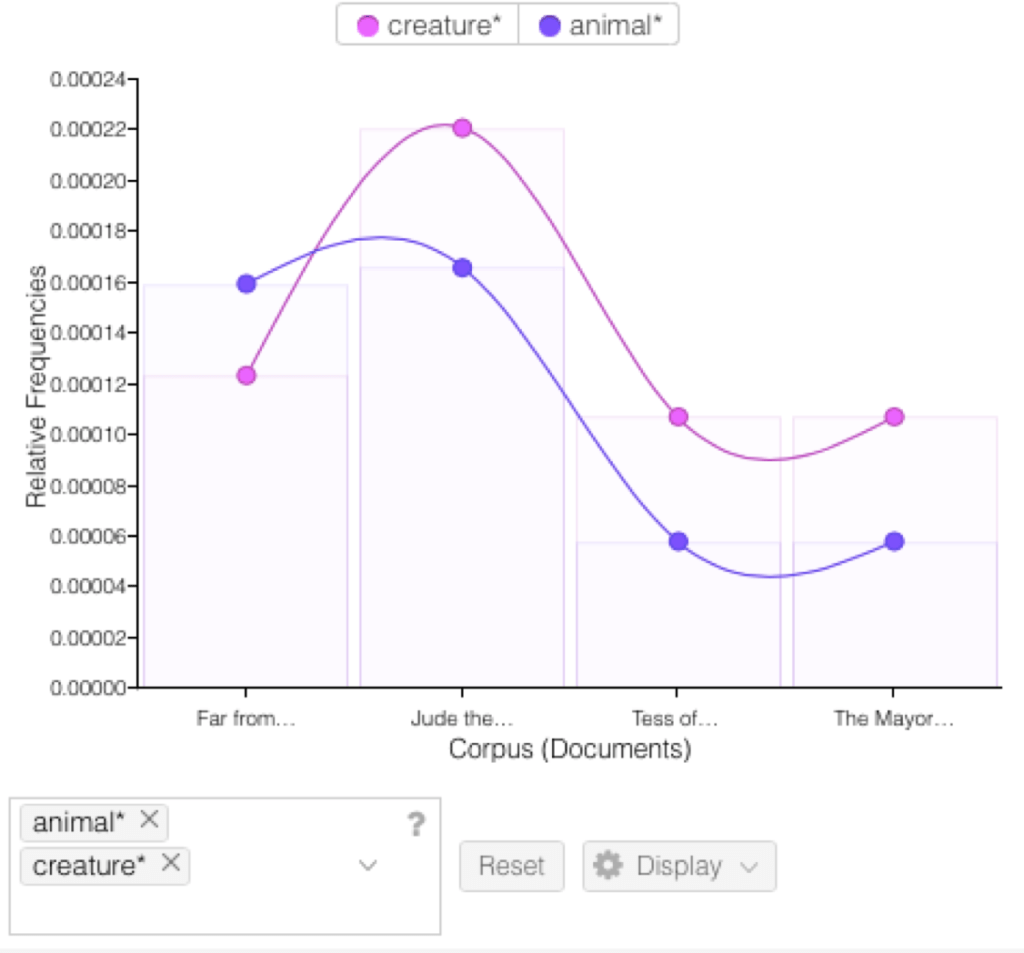 While going through Thomas Hardy’s work in these books, we noticed that the way he illustrated animals stood out. We found that when speaking of dogs, lambs, bulls or other animals, Hardy would use the word “creature” and not “animals”, and this shows by the number of times he used the word “creature”: it was applied 75 times in all four novels. The trend line also shows this revelation, we can see that the usage of the word “creature” keeps on increasing progressively, while the usage of the word “animal” decreases. It also came to our attention that Hardy referred to humans as “creatures” as well, which shows that he wants to make humans and animals equal, without any superiority between the two species. We can see that through some examples taken from the books “After placing the little creature with its mother, he stood and carefully examined the sky, to ascertain the time of night from thWhile going through Thomas Hardy’s work in these books, we noticed that the way he illustrated animals stood out. We found that when speaking of dogs, lambs, bulls or other animals, Hardy would use the word “creature” and not “animals”, and this shows by the number of times he used the word “creature”: it was applied 75 times in all four novels. The trend line also shows this revelation, we can see that the usage of the word “creature” keeps on increasing progressively, while the usage of the word “animal” decreases. It also came to our attention that Hardy referred to humans as “creatures” as well, which shows that he wants to make humans and animals equal, without any superiority between the two species. We can see that through some examples taken from the books “After placing the little creature with its mother, he stood and carefully examined the sky, to ascertain the time of night from the altitudes of the stars” (lamb), “Oak took it up, thinking it might be better to kill the creature to save it from pain…” (toad), and “He was a huge, heavy, and quiet creature, standing darkly against the low horizon…” (dog).