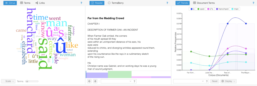 Reading Voyant Tools proved to be a rather new and interesting experience; distant reading is very different from the regular in-depth analysis of a text. Using Voyant Tools with distant-reading techniques enabled the possibility to read and analyze many texts in an efficient manner; seeing as how this method depends on graphs instead of words in the text, using such a tool saves so much time. Although beneficial, using distant reading does not give a deep, scrutinized analysis of the text; it could fall short in terms of truly reading into the text for deeper meanings, as it offers short, shallow readings. For instance, before starting writing novels, Hardy studied architecture. Architects are known to depict things in an aesthetic and detail-oriented way, therefore, it is interesting to see how this affects the way he depicts places and structures. In order to get a clear image, it is important to closely read the chapters instead of distant reading given that distant reading is what we do in Voyant Tools. In addition, distant reading doesn’t allow Hardy’s writing style to illuminate given that it is of great importance. Digital analysis is needed before distant reading, and then when we could find captivating word usage or trends and descriptions in precise books, going back to close reading of chapters to strongly develop ideas and analyses is therefore possible and advisable.