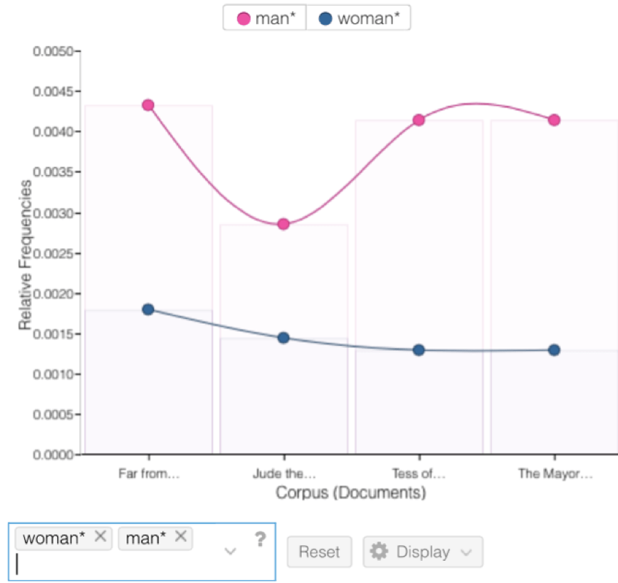 In the Cirrus, we can clearly see the word frequencies in the chosen selection of Hardy’s works. However, we are unable to assess the contextual background of each word. That being said, we decided to move to the Contexts tool to better understand the significance of the words in close reading to derive conclusions based on the different contexts. Next, we utilized the Reading tool in order to interpret the different contexts of each word to gain a deeper understanding. In addition, we used the Trends tool to verify whether or not the usage of the word was subject to a particular trend.