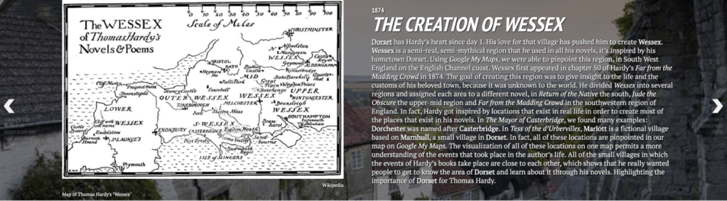 Four layers were mapped on the platform: Hardy’s Early Years, Achievements, Early Career and Literary works, and Death. We were able to map Thomas Hardy’s life and we understood how his childhood effected his writing. However, the most crucial finding we learned from google my maps was the creation of “Wessex”. We found that Hardy created “Wessex”, a semi-real, semi-mythical region that he used in all his novels, however this place is not purely fictional, it is named after Anglo-Saxon kingdom that existed in the southern region of England, Dorset pinpointed in Google My Maps. He chose to create “Wessex” and include it in all of his novels because it’s where he grew up, and felt like this small area was unknown to people so he wanted to give insight into its customs and introduce people to it. He divided Wessex into several regions (south, mid, upper) and assigned each area to a different novel. By doing that, he hoped to create a “series of novels”. For example, in his novel Jude the Obscure (1895), the events of the novel took place in upper-mid Wessex, in Return of the Native (1878), the events take place in South Wessex, and the events of Far from the Madding Crowd (1874), start in Teller Down Gate a region in the southwestern region of England. This was immediately integrated in our TimelineJs project. It was a very important because it shows how Thomas created this relationship between fiction and non-fiction.