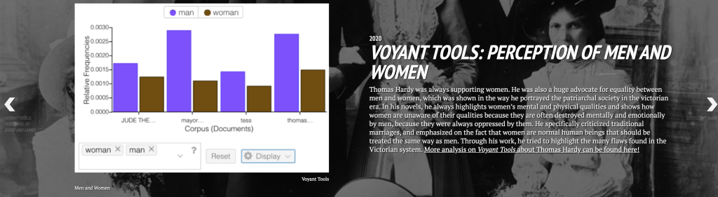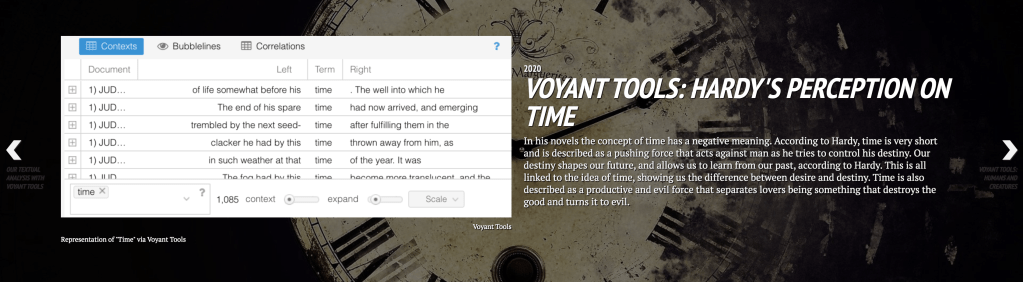Voyant was another amazing tool that we learned throughout our ENGL256B course. It opened our eyes and showed us other sides of Thomas Hardy. One of our interesting findings that helped us in our final DH project was “time”. The word “time” is remarkably used in Hardy’s novels. Furthermore, using the Contexts tool, Hardy’s use of the word “time” seems to hold a negative connotation in his novels. For example, “little time for correction by experience”, “afraid all this is taking up your time and giving trouble”. “striking of quarters seems to quicken the flight of time”. These quotes indicate the shortness of time which we are constantly battling against. Hardy’s main themes are marriage, death, and social pressure (Philip V. Allingham, 2014). Nevertheless, each theme is portrayed in a negative light, and Thomas Hardy’s perception of time is that it’s a pushing force that acts against man as he tries to control his destiny. Hardy views our destiny as shaping our futures, and learning from our pasts (such as Tess’ struggle to overcome her past), all linking back to the main theme of time. Thus, there is a clear discrepancy between longing and destiny.
