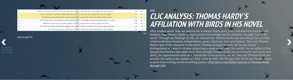 Also in Tess of the D’urbervilles, we found another interesting finding which is also related to our Voyant analysis. Tess in the novel seemed desperate for angel. So, this triggered our inspiration into looking furthermore why Tess is always in need of marriage. With close reading, it seemed as if Tess was desperate, lonely, poor, and without freedom. We started to think why is Tess like that, so we kept on searching for terms (freedom, lonely, desperate, and etc.) After extensive research, we found the term “birds” being used. But that begs the question: Are birds only an object or do they symbolize Tess’s personality? Searching the term birds and close reading we noticed that, birds relate to Tess personality. That was very astonishing because “Birds” symbolize freedom and innocence. The fact that birds were affiliated with humans led us to our third goal!